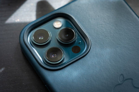 London, England - 11.23.2020: Close up of lidar sensor and triple cameras on new iPhone 12 Pro Max. Action. 5G smartphone model by Apple Computers of Pacific Blue color isolated on white background.