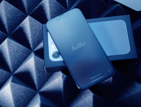 turning on and restart new iPhone with Apple logo and on the screen. Apple is a multinational technology company. Moscow, Russia - January 14, 2021