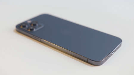 Shenzhen, China - 10.8.2020: Close up of a new iPhone 12 Pro Max isolated on white table background. Action. New device of Pacific Blue color.