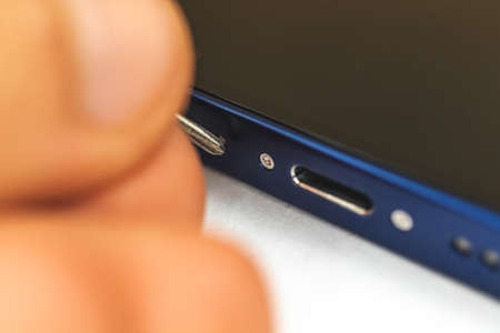 Kharkov, Ukraine - March 10, 2021: Apple iPhone repair concept, close up of small screw and charge connector