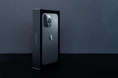 Valencia, Spain - January 16, 2022: New graphite iPhone 13 Pro in its box on a dark background with empty space to text