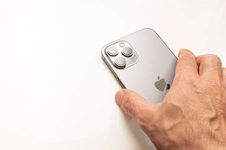one hand holding the new Iphone 12 pro Max seen from the back, on a white background, copy space, horizontal