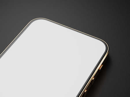 A smartphone with a golden body is on the table. Part of the smartphone screen. Smartphone mockup on a dark background. Mockup for your application or website. 3d render.