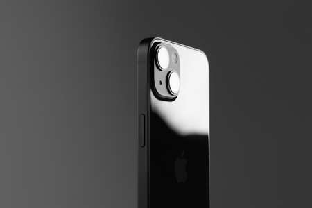 new modern mobile phone iPhone 13 in black color against a gray wall