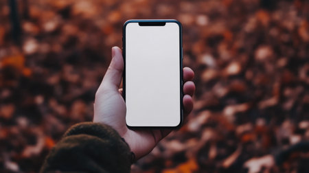 White background features an empty smartphone held by hand against a stark contrast showcasing conceptual design of technology and communication