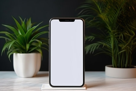 Empty mobile phone screen mockup, a green plant of a wooden table, a layout with space to copy