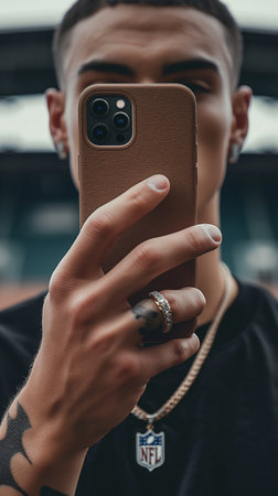 Stylish young man in a black T-shirt with a tattoo on his arm holding a mobile phone