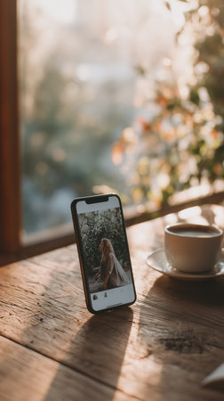 Morning coffee with a phone showing a picture near a window with sunlight