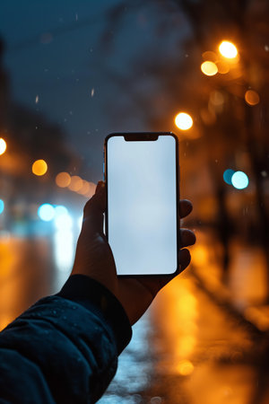 Hand holding mobile phone, capturing illuminated city nightlife with digital display generated by artificial intelligence