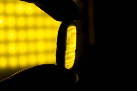 Silhouette of fish capsule held by a woman fingers