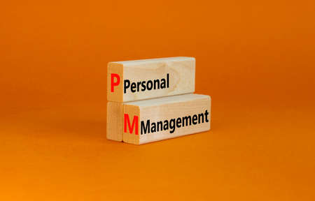 PM Personal management symbol. Concept words PM Personal management on wooden blocks on a beautiful orange table orange background. Business and PM personal management concept.