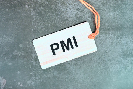 PMI Letters, Purchasing Managers Index. Global economy concept. PMI on a light card on a gray background. View from above