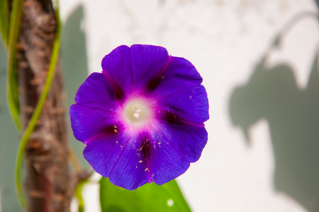 Morning glory vine creeping up a brick wall, its deep purple flowers adding a burst of color to the scene