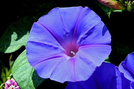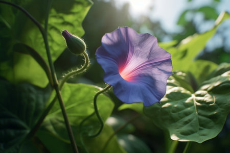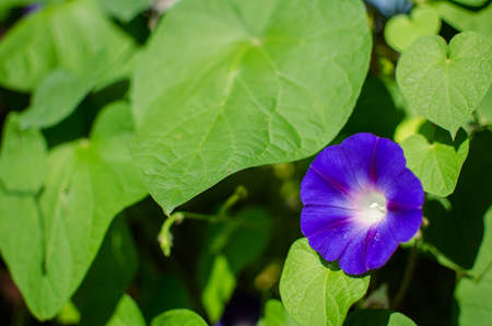 Beautiful violet morning glory flower with green leaves background in sunlight