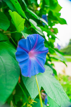 Beautiful blue morning glory flower blossom known as convolvulaceae in a green bio sphere garden on a sunny spring day as close-up in portrait image