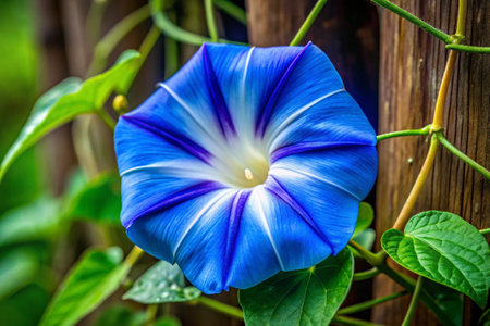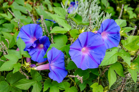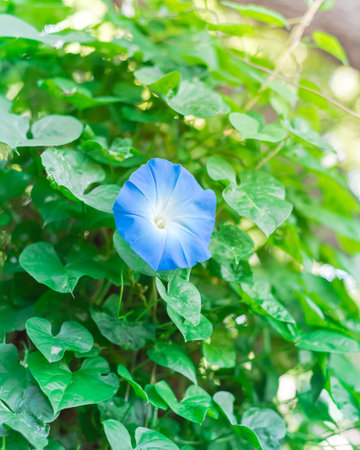 Close-up blooming morning glory blue heavenly flower on vine at backyard garden near Dallas, Texas, America. Homegrown blossom Ipomoea purpurea tricolor with lush foliage background