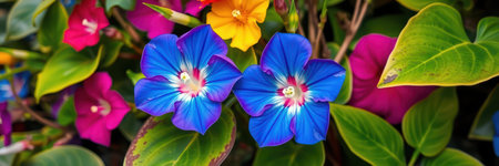 Two blue flowers bloom in the midst of green leaves and other colorful blossoms