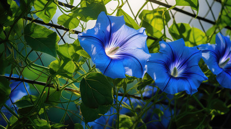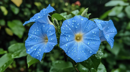 A striking close-up of blue morning glory flowers adorned with dew drops, symbolizing freshness and beauty in a lush green garden setting.