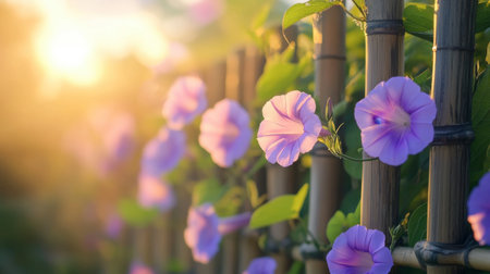 Morning glory flowers wrapped around a bamboo fence, their delicate petals glowing in the warm morning sun