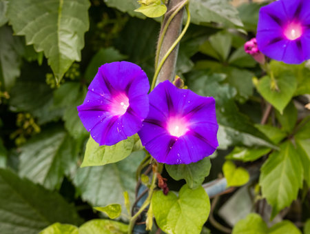 Beautiful Morning Glory Flower with Dew Drops on Violet Petals Captured in Stunning Garden Detail