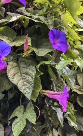 Purple bright flowers and morning glory leaves with a small spider on one of the leaf in nature, ipomoea.