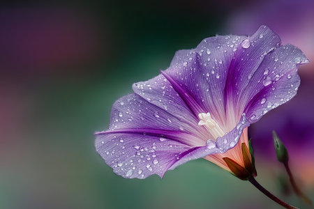 Violet Morning Glory Blossoms with Dew in Soft Focus, A Stunning Floral Photography Masterpiece.
