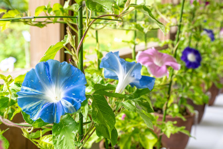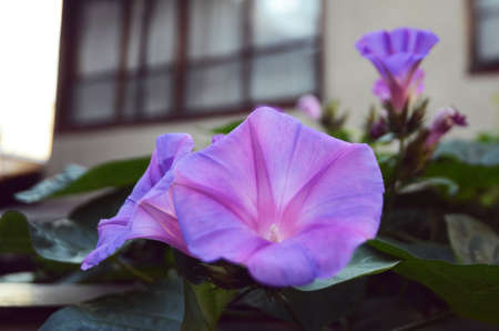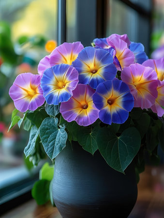 Morning glory flowers in a pot on a window sill. Close-up