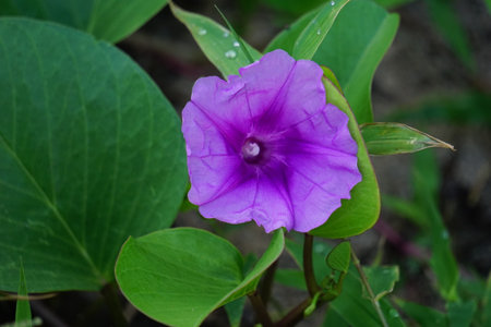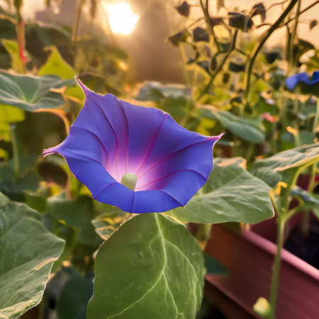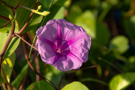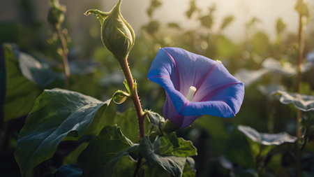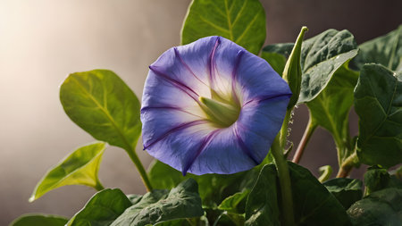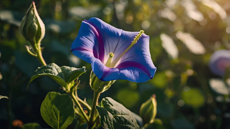 Blooming purple morning glory flower showcasing its vibrant petals and intricate details under natural light in a garden setting, ideal for backgrounds