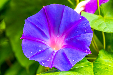 Sky blue, morning glory, Heavenly Blue or ipomoea purpurea flower in full bloom and foliage in garden