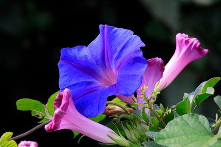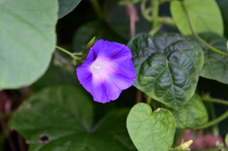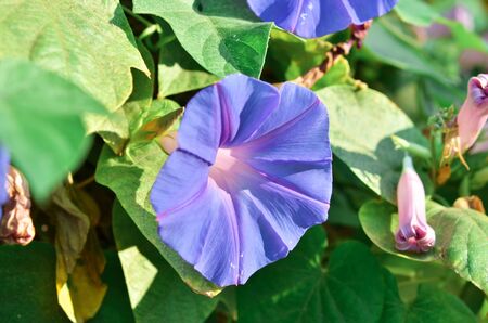 morning glory. blooming flower in garden. blue flora with vine leaves