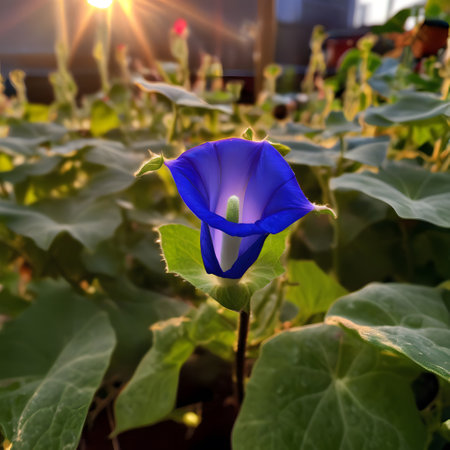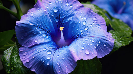 Glistening deep blue petals of a morning glory bloom, radiating delicacy and elegance in natural soft light