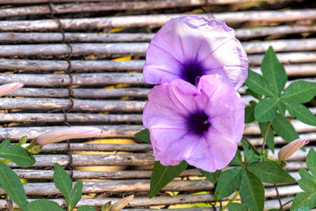Flowers of Ipomoea cairica perennial plant close-up on blurred bamboo background