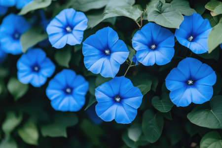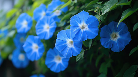 Vibrant blue morning glory flowers are blooming on a vine surrounded by lush green leaves