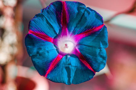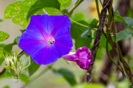 Deep Indigo, blue and Purple Petunia Flowers in Summer in garden. Three Colored Morning Glory. Large lilac flower with sparkling petals with a pink five-way star. Ipomoea purpurea.