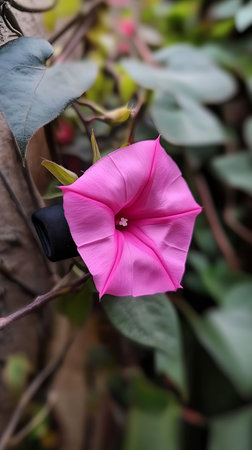 A captivating close-up view reveals a vibrant pink morning glory flower, showcasing its delicate petals and intricate floral structure amidst a backdrop of lush green foliage.