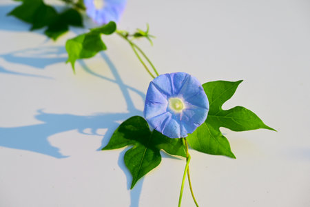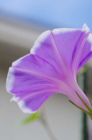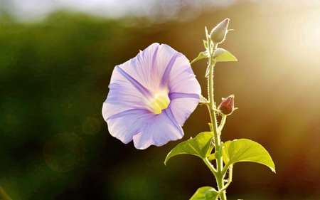 One delicate light blue purple flower of Ipomoea purpurea, commonly known as common morning glory in a garden in a sunny summer day, beautiful outdoor floral background