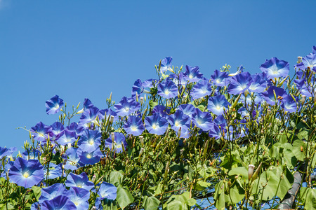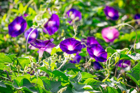 Many delicate vivid blue and purple flowers of morning glory plant in a a garden in a sunny summer garden, outdoor floral background photographed with soft focus
