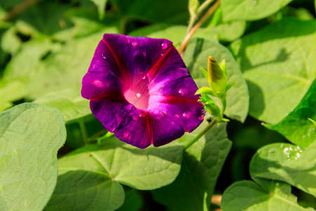 Violet flower bindweed close up on a background of green leaves. - Image