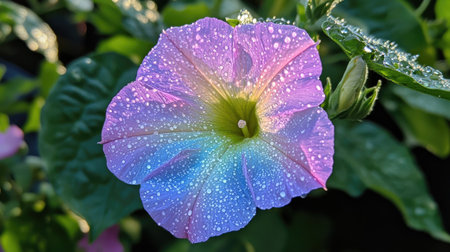 A delicate flower in full bloom, its colorful petals sparkling with dew drops in the early morning sunlight, highlighting the freshness of a new day