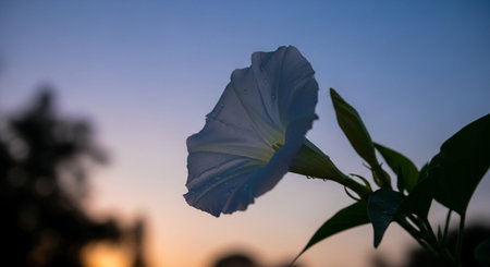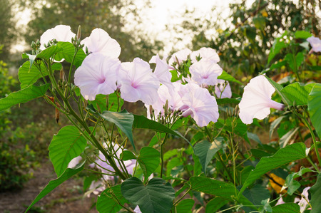 Beautiful morning glory flowers in the garden at sunset. Nature background