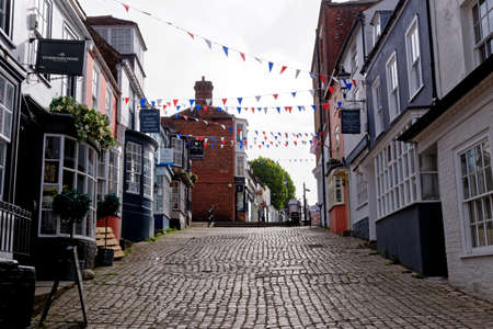 Lymington Hampshire - colorful rendered walls and bay windows on shopfronts along hilly cobbled Quay Hill street in England UK - 20th of May 2021
