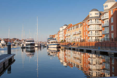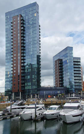 Modern high-rise buildings in Ocean Village, in Southampton Harbor with yachts in the foreground, vertical
