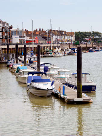 Boats of all sizes moored up in Preston Marina, Lancashire.