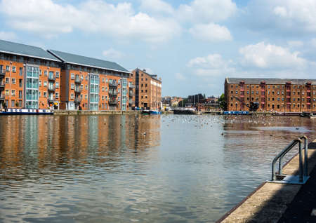 Modern apartment blocks and traditional canal craft at Gloucester.