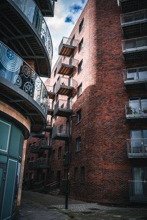 LEEDS, UNITED KINGDOM - Mar 04, 2017: View looking towards the flats at the end of Leeds Dock on a cloudy day.