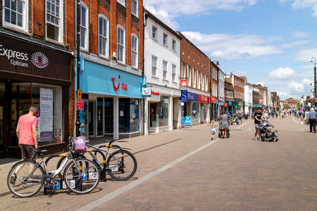 Newbury, Berkshire, England, UK. 2022. Shoppers on the High Street in Newbury on a sunny afternoon. England UK.