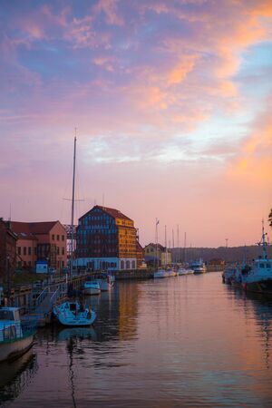Beautiful pink and orange sunset in the sea harbor with moored yachts. Sochi, Russia.