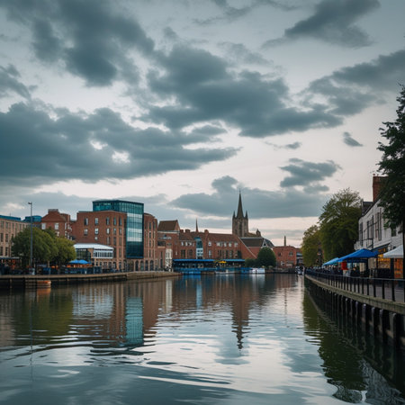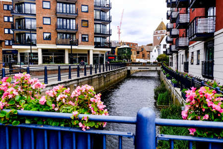 View of houses by Kennet River in town center of Reading, United Kingdom