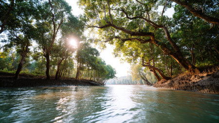 A calm river nestled within a lush mangrove forest, illuminated by gentle sunlight filtering through vibrant green leaves, inviting serenity and peace.
