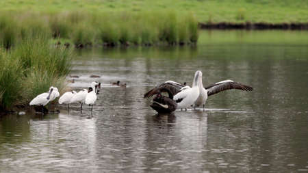 Variety of birds standing in shallow water at a bird sanctuary